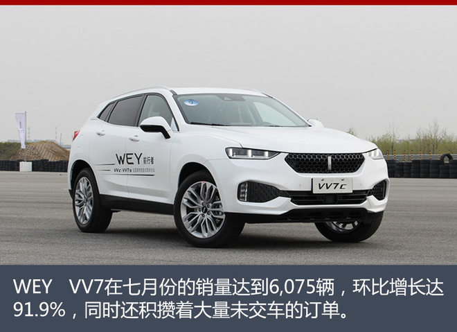 长城汽车旗下高端品牌WEY的首款车型VV7自5月末开始陆续交车,VV7在7月份的销量为6,075辆,环比增长达到91.9%。据长城汽车此前介绍,WEY VV7订单量已突破两万辆。同时WEY官方强调,这只是一个开始,WEY计划在年内达到10万台销量。