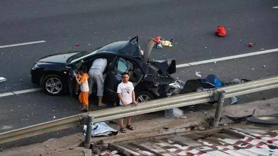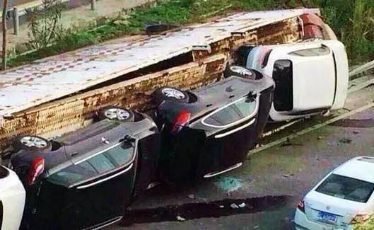 大货车车上的12辆汽车也全部砸落到地面,受到不同程度的损伤。而这12辆车不乏有保时捷、宝马、奥迪车型,可谓损失惨重。大货车司机则被困车内,等待救援。马自达轿车车内乘员则在道路一边看着惨烈的事故,头上还流着血。
