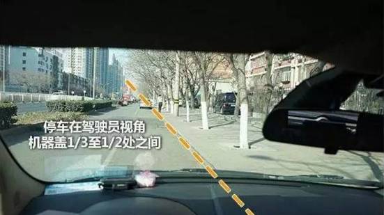 方法七:方向右转90度向路边靠,当视线车盖中心点与边线相交时向左回方向180度,当视线车盖右三分之一处与边线相交时回正方向,根据个人身高微调前行。 有的身高比较矮可以看雨刮,用雨刮突起去对线,或是后视镜里门把手与线相切发动机盖右边7字槽对边线,车轮距离边线30公分。