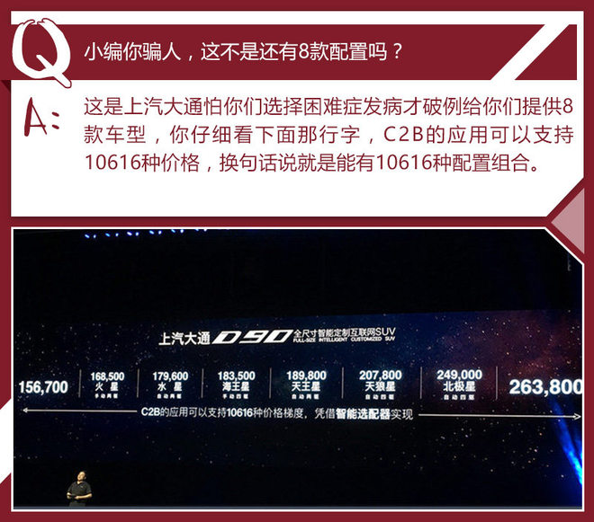 8月8日晚,上汽大通D90正式上市,新车共有8款配置,售价区间从15.67万元至26.38万元。D90是上汽大通的首款SUV,除了超大的尺寸与出众的设计吸睛,C2B个性化定制的玩法也是大家闻所未闻的,从车身内饰颜色到配置甚至驱动形式都能自由组合搭配。因为高度个性化定制,因此即便是入门车型我也给了四颗星的评价,觉得哪个配置不够用你就自己增加啊,人性化程度做到这样真没得说。