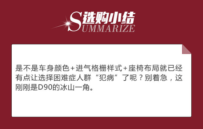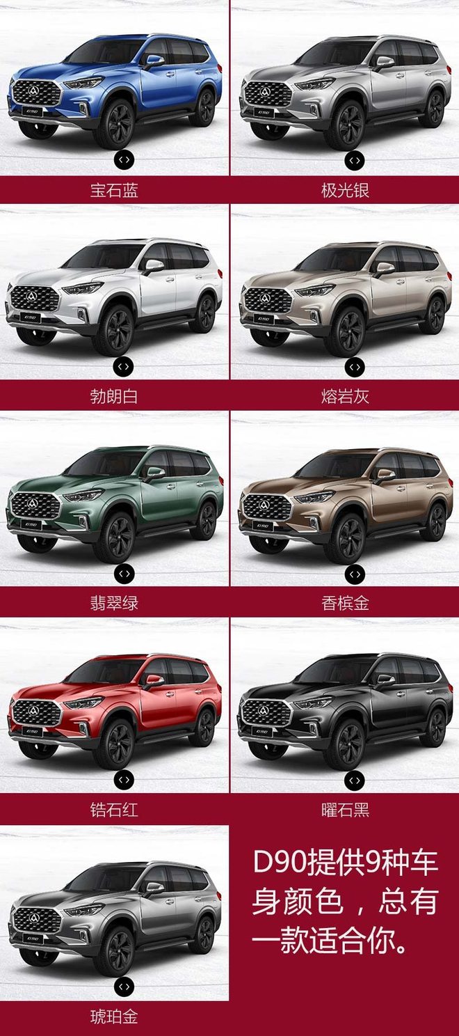 考虑到D90中大型SUV的定位,双色车身显然太过俏皮可爱,不过它还是提供多达9种外观颜色可供选择。
