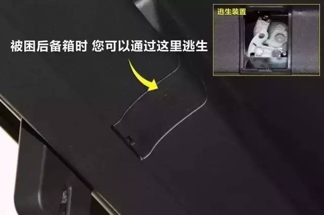 拉线拉环逃生装置:在后备箱有个拉线或者拉环,往后使劲一拉,后备箱锁扣即可打开。