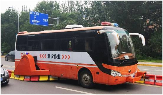 在旅游路浆水泉路口,这辆黄色的“马路拉链车”车身尺寸和中型客车相当。除了车身喷涂的“潮汐车道”的标识和车顶的警灯,这辆车在外观上与普通客车最大的区别在于车头左侧的收集器和车尾右侧的布撒器。收集器和布撒器呈中空的方形,用于将水马隔离墩导引入车体内。