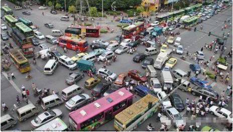 广西南宁市某十字路口的红绿灯在下班高峰时突然失效,4个方向的车辆都想抢先通行,结果4条车道都堵了将近一公里的车!