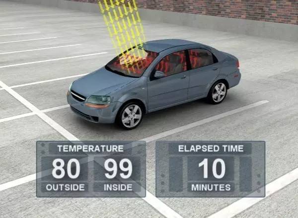 即使是在外界气温22℃、让人感觉凉爽的日子,车内温度依然可以上升到47℃。并且,即使给车窗留下3.8厘米(1.5英寸)的缝隙,也不能显著降低升温速度。