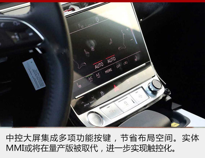 新车内饰采用奥迪家族式设计风格,中控台至副驾贯穿横向空调出风口。大尺寸中控触屏设计也减少了实体按键布局占比,整体造型简洁。值得一提的是,MMI人机交互系统可能因触控技术的发展而被取代,未来的MMI旋钮更有可能采用全平面触控面板。