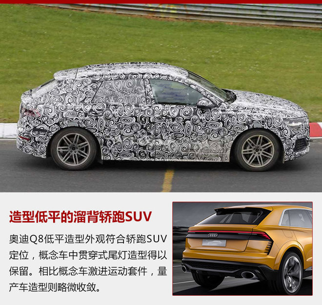 奥迪Q8定位轿跑SUV,采用溜背设计,较同门Q7略低矮的车身姿态配合更宽大扁平的进气格栅,突出运动定位。无伪路试车型采用的运动造型轮毂配合低扁平比轮胎,降低视觉中心,贯穿式尾灯设计从刚刚发布的奥迪家族旗舰车型A8上延承下来。