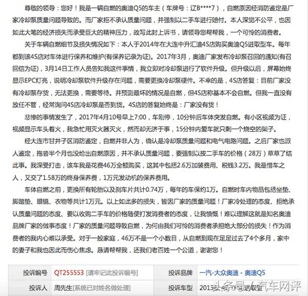 从周先生慷慨陈词的投诉中可以看出其心情的愤怒,冷漠地抛出二手价格就想了事。28万可能对于Q5来说虽然是个正常的二手价格,但是这不是周先生想卖车,而是4S店的不负责任与奥迪本身的设计缺陷导致自燃的,新车办下来46万,用车期间还投入了不少钱,加上车上物品的损失,奥迪厂家就完全忽略了。