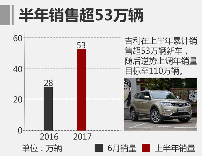 吉利在上半年销量突破53万辆,并逆市上调了其2017年销量目标。网通社从吉利汽车官方获得了上半年的财报,公司上半年营收达394.2亿元人民币(单位下同),同比增长118%;净利润达43.4亿元,同比增长128%;基本每股收益48.77分,同比增长120%。