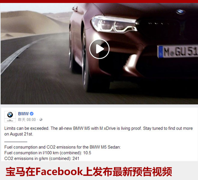 宝马全新一代5系已正式上市,性能版M5也将推出换代车型。网通社从宝马官方Facebook获悉,宝马全新一代M5将于8月21日正式发布,并将于法兰克福车展正式亮相。宝马公布了一段新车最新的预告视频,新车采用了酒红色涂装,采用了较为激进的外观套件 。