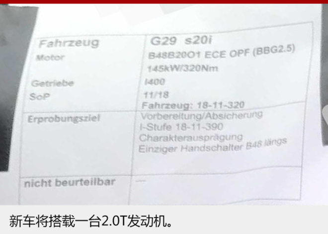 全新一代Z4将搭载“G29 s20i”2.0T涡轮增压发动机,最大功率为145千瓦,峰值扭矩达到320牛米,与发动机匹配的传统系统为6速手动变速箱。另外其还会推出一款高功率2.0T发动机,最大功率为187千瓦。