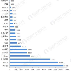 从共享汽车企业来看,国内注册运营分时租赁的企业数量已经300多家,然而上规模的企业并不多。其中微公交以9400辆的运营车辆排名第一,其次为Evcard、盼达汽车、Gofun、Greengo等企业。随着2016年EVcard和e享天开合并为新的环球车享后,其运营车辆数量超过微公交而排名第一。大部分运营商的运营车辆仍在500辆以下,尚不具备规模效应。
