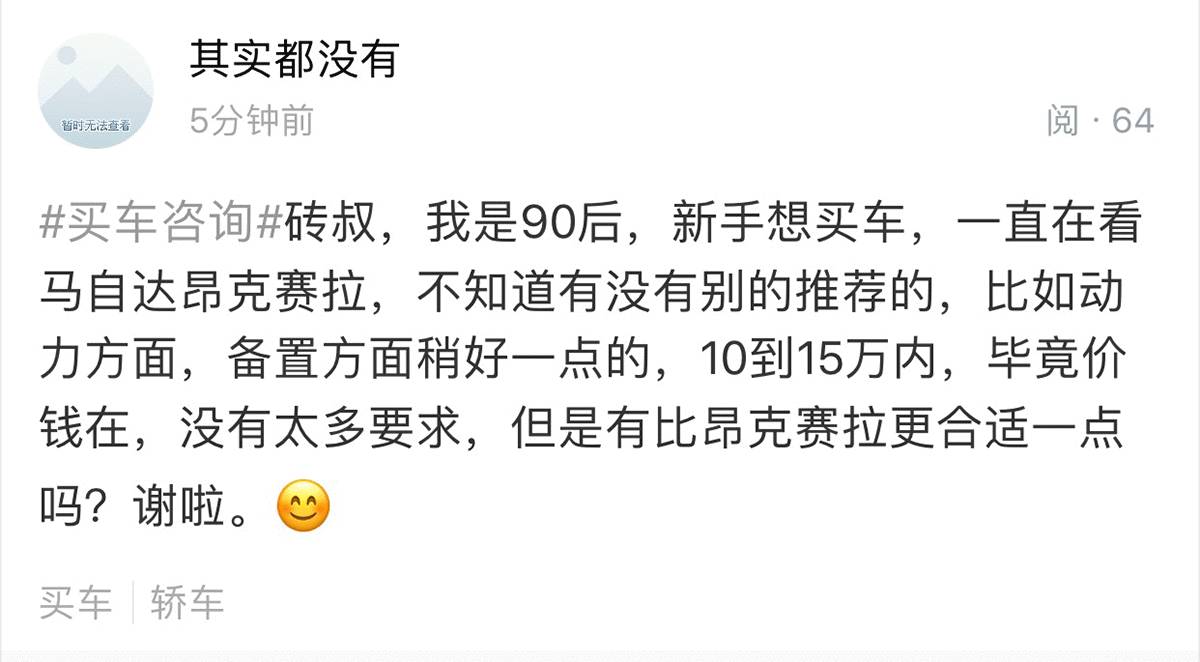 在咱们“有车以后”小程序的论坛社区里,有位90后砖粉咨询买车的问题:有意买昂克赛拉 (配置|询价),但还未拿定主意,对动力和配置方面有要求,预算在10-15万元之间。砖叔这就来支支招,推荐几款车型。