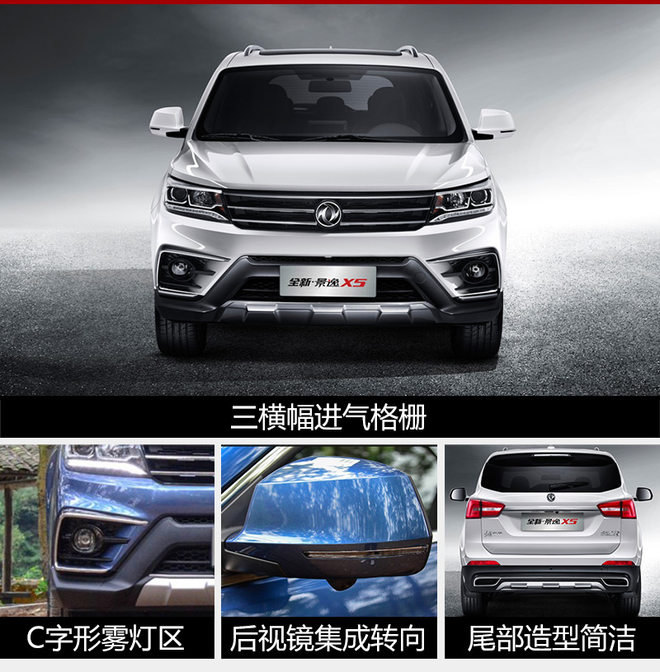 景逸X5 1.5T车型尺寸为4515*1812*1725毫米,轴距为2720毫米。1.5T车型外观与现款基本一致,三横幅进气格栅搭配车头平直线条修饰,造型大气;雾灯区采用C字型镀铬装饰,凸显设计感。车侧外后视镜集成转向灯,造型精致;新车尾部线条简洁,镀铬包围配银色防擦条,烘托越野氛围。