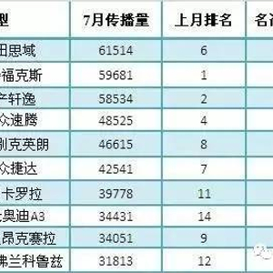 7月中型轿车品牌传播量10强排行榜