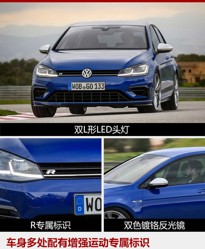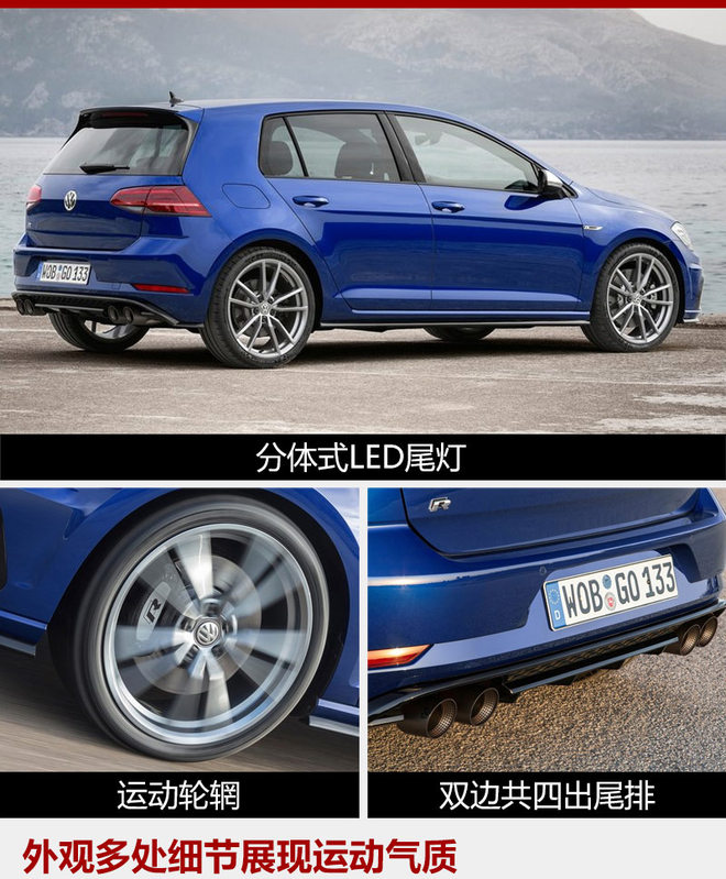尾部方面,新车采用全新设计的尾灯组,并且配备LED灯源,新款高尔夫R继续采用双边四出布局的排气以增添它的运动感。同时,作为高性能车,高尔夫R配备银色后视镜和蓝色刹车卡钳等标志性设计元素。
