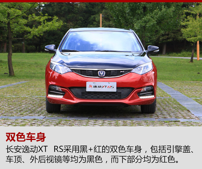 新车前脸进行了全新设计,采用分体式蜂窝状进气格栅,搭配铬合金装饰条,并带有红色“RS”标识,彰显身份。车身采用红黑撞色涂装,发动机舱盖、A、B、C柱以及顶篷均为亮黑色,具有强烈的视觉冲击感。