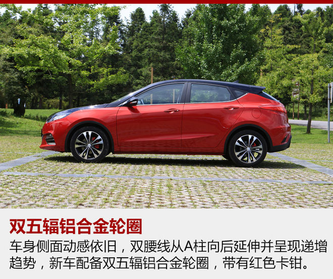 车身侧面腰线位置升高,搭配双五辐合金轮圈及黑色轮拱,并采用红色刹车卡钳。后视镜外壳采用深灰色点缀,更加凸显新车RS车型的定位。