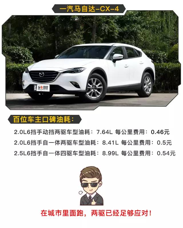 相比较之下,如果喜欢外观时尚、油耗低、底盘更适合运动的消费者,可以选择马自达CX-4;如果喜欢美系的设计、不介意油耗,可以大胆选择福特翼虎;如果想既有硬派越野的底气,又要时尚、动感的造型,可以选择油耗表现中庸的欧蓝德。
