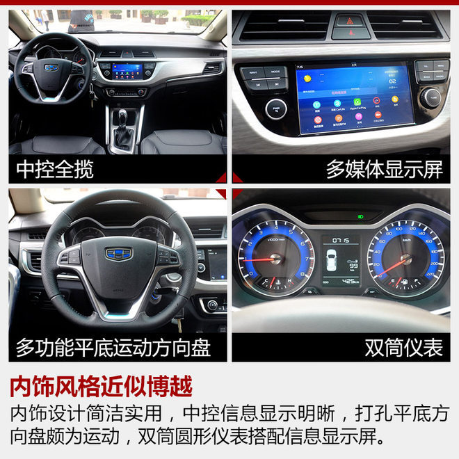 内饰方面,新车设计风格与自家SUV旗舰博越相似。仪表盘黑色表板整体沉稳大气,屏显区银色拉丝饰板辅以镀铬装饰,精致细腻;中央触控屏集成多媒体控制、电话、行车信息显示与车辆功能设置等,下方实体按键整合空调控制面板,配合小屏示数显示,简洁易读。多功能打孔方向盘采用平底设计,彰显运动氛围,功能控制按键布置两侧,左边是定速巡航启动与解除以及速度设定按键,右侧负责多媒体影音控制。