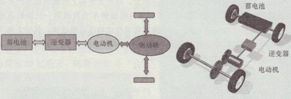 典型的纯电动汽车动力系统组成如下图所示,由蓄电池、逆变器、电动机组合,由电动机驱动驱动轴。