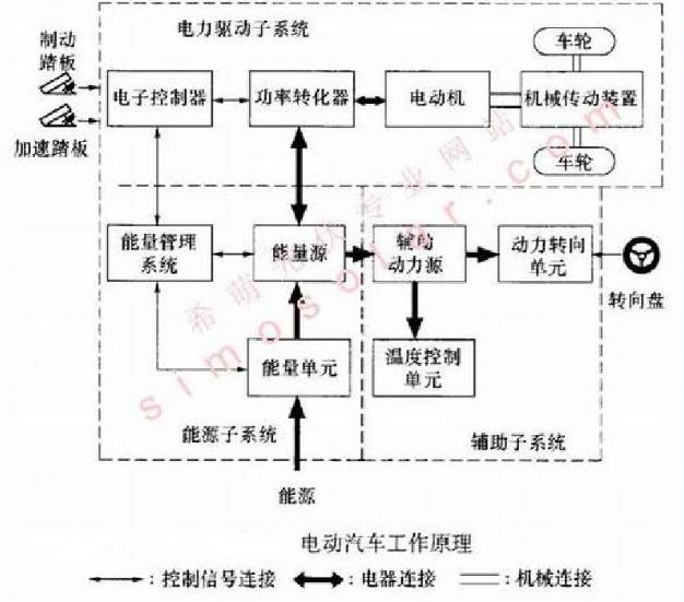 电力驱动子系统由电控单元、控制器、电动机、机械传动装置和驱动车轮组成。主能源子系统由主能源、能量管理系统和充电系统构成。辅助控制子系统具有动力转向、温度控制和辅助动力供给等功能。