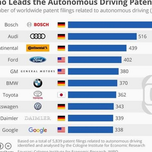 许多公司已开始测试并验证各自的自动驾驶技术,但对于圈外人士而言,目前却难以判断究竟哪家公司在引领自动驾驶车辆的业内竞赛。为便于判断公司在自动驾驶车辆领域的投入及贡献,或可采用各大公司在该领域内所取得的专利数量,将其作为一项重要的衡量指标。科隆经济研究中心(Cologne Institute for Economic Research)采用并分析了与自动驾驶车辆相关的5839项专利,评选了在自动驾驶领域排名行业前沿的十大公司,如上图显示。