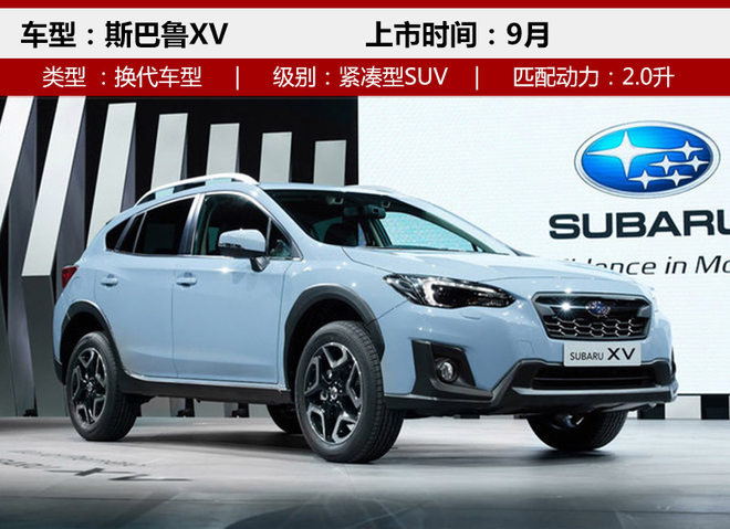 斯巴鲁全新一代XV于今年3月正式亮相,采用的全新SGP(Subaru Global Platform)平台在三个方面实现技术性突破:能够让斯巴鲁车辆拥有直达驾驶者感官层面的高品质行驶质感;能够为斯巴鲁带来显著安全性能升级;应对未来电动汽车发展趋势。新车外观采用最新的“DYNAMIC x SOLID”设计语言,整体设计延续了其一贯的跨界风格;动力方面搭载一台2.0升自然吸气发动机。