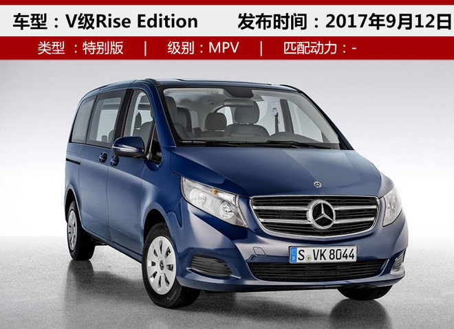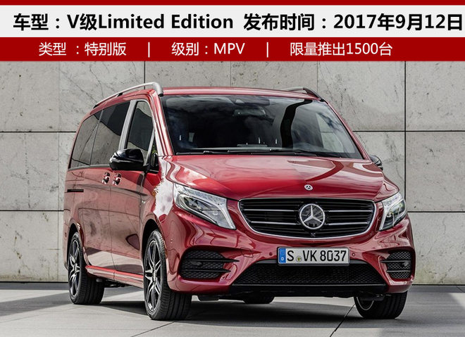 两款V级特别版车型将在次日开幕的法兰克福车展上正式亮相,新车定位为MPV,整体外观延续家族化设计理念,红/蓝配色显示出其独特的特别版车型的身份。在外观设计上与普通版车型并无差别,家族化进气格栅同样用镀铬加以装饰,大尺寸盾标展现整体豪华理念。另外V级Limited Edition车型在全球市场范围内限量1500辆进行销售。