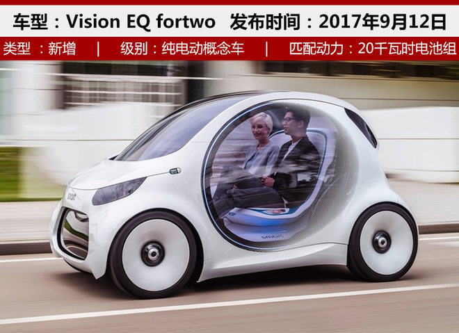 Vision EQ fortwo最初的打造理念是以车轮以上椭圆形乘舱构架为基础,实现单位面积内立体空间利用的最大化,满足基本城市通勤需求;在此基础上,smart fortwo纯电动概念车还适配于梅赛德斯·奔驰在未来城市交通,对于“互联”、“共享”、“自动”以及“电气化”领域的设计构想。