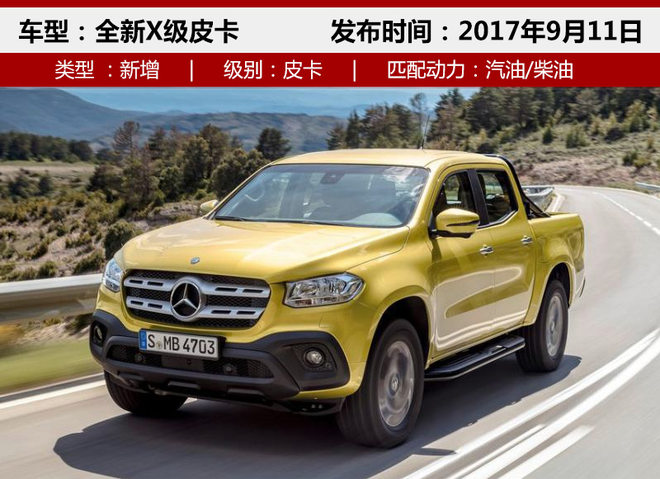 即将发布的全新奔驰X-Class共推出由低到高PURE、PROGRESSIVE、POWER三种外观样式的不同车型,并配备9种外观颜色进行选择。车身尺寸方面,长/宽/高分别为5,340*1,920和1,819毫米,轴距为3,150毫米,货箱长/宽/高分别为1,587*1,560*474毫米。