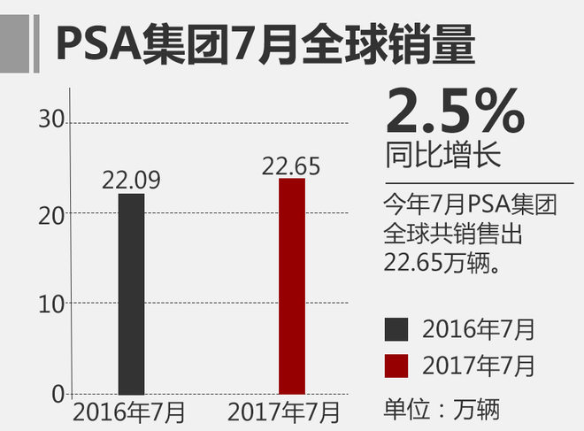 从公布的最新销量数据来看,PSA集团7月在全球市场共售出新车22.65万辆,相比去年同期的22.09万辆增长2.5%。再看今年累计销量情况,今年1-7月PSA集团共销售新车180.64万辆,相比去年同期的176.51万辆,增长2.3%,全球整体销量处于微增状态。