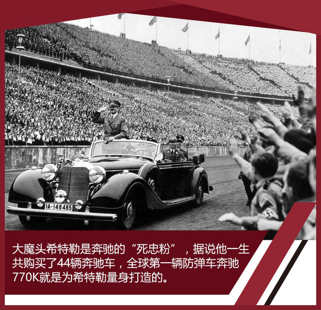 两家公司合并之后,戴姆勒-奔驰公司迎来了一位“死忠粉”,据说他一生中购买过44辆奔驰汽车。1933年希特勒上台,欧陆 (配置|询价)风云激变,列强间暗流涌动,戴姆勒-奔驰为这位“死忠粉”量身打造了一辆造型典雅又厚重的“大奔”,它载着日耳曼民族的“希望”在大街上接受狂热民众的欢呼。然后这个所谓的“希望”再次带领着德国走上了战争之路。作为给这个人提供座驾的奔驰,自然又成为了第三帝国战争机器的一部分。