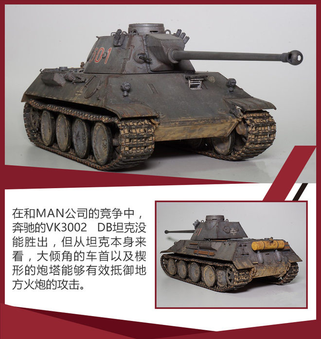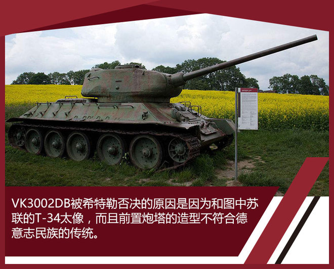 戴姆勒-奔驰另外一个坦克VK3002 DB就不算太成功了,它在竞标中输给了MAN公司的方案,后者是二战中德国著名的豹式坦克。其实VK3002 DB是一款很有潜力的产品,它借鉴了苏联著名坦克T-34的设计,大倾角的车身和炮塔具有相当不错的跳弹造型,并且在装甲厚度不大幅增加的前提下通过大倾角提高了装甲厚度。说起来它竞标失败的理由也挺奇葩,据说是因为希特勒本人认为VK3002 DB前置炮塔的造型没有中置炮塔的看上去符合日耳曼民族的审美标准,而且造型太像苏联的产品。