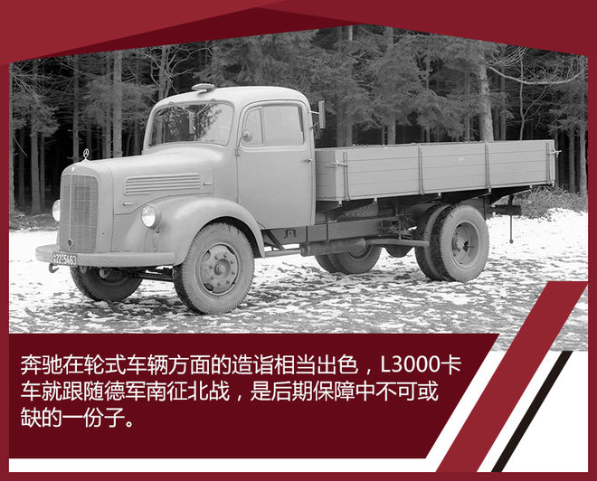 不过戴姆勒-奔驰公司的重头戏是在轮式车辆上,其中L3000卡车是它在战争期间中生产最多的车辆,达到了27000辆。此外戴姆勒-奔驰公司还生产L4500重型卡车,对苏战争开始后,为了应对冬季冰雪造成的路面泥泞的情况,L4500重型卡车还发展出了L4500R半履带式的型号,能拉着4吨半的物资在非铺装的地面上最远行驶100公里,成为东线作战的德军中不折不扣的驿马。