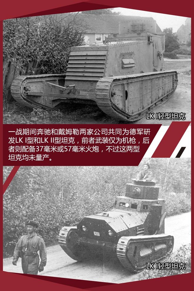 第一次世界大战开始后,奔驰和戴姆勒两家公司为德军提供了大量的运输车辆,除了运输车外,这两家公司还参与研制了两款轻型坦克LK I和LK II型,这是德军为扭转战局所做的努力之一,计划制造580辆但是直到战争的结束也才生产出两辆原型车。