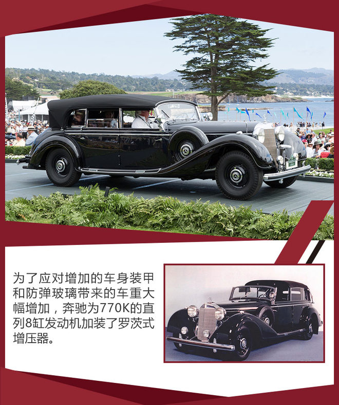 再说这辆定制的“大奔”,它的来头可不小,是世界上第一款防弹汽车奔驰770K,它的车身增加了4毫米厚的特殊钢板,使用了5厘米厚的防弹玻璃,这些导致了车身重量增加到3.6吨。为了能够推动这台车前进,奔驰给原本的8缸发动机增加了罗茨式机械增压器。希特勒对这款车一见钟情,无论是检阅部队还是到地方视察都乘坐这款车,奔驰770K一共生产了17辆。