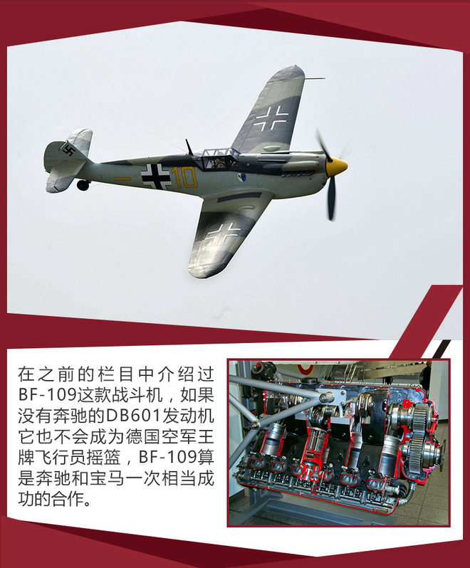 除了地面载具之外,戴姆勒-奔驰公司另一个重要领域就是飞机发动机,二战中德军主力战机、由巴村飞机制造厂(巴伐利亚飞机制造厂)制造的BF-109系列战斗机搭载的都是戴姆勒-奔驰公司提供的DB600系列发动机。其中DB601发动机就是一款划时代产品,它比原先搭载在BF109上面的容克210发动机功率高出快一倍,达到了1050马力,而容克210只有605马力。DB601发动机另一个突破性设计就是供油方式从化油器变成直接喷射(是现在歧管喷射和缸内直喷的雏形),这非常有利于飞机在空中做机动动作,而装配化油器供油方式发动机的飞机在做机动动作时就要面临因液面变化而无法将油抽取上来进而导致发动机熄火的风险,这种空中“停车”的情况相当危险,驾驶员说死就死。