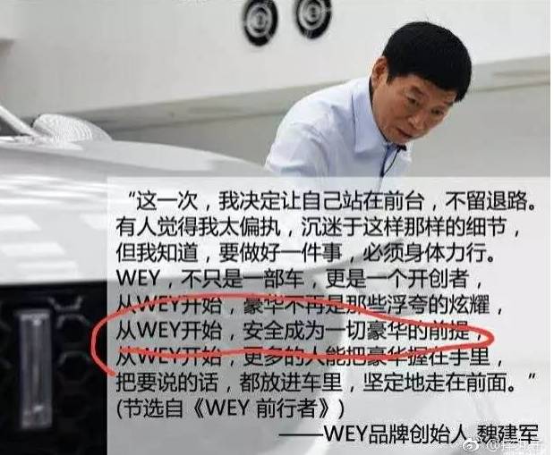 如今这个“名”也有了,就叫做“WEY”,长城老板魏建军以自己的姓氏,作为此豪华品牌的名字,很直白的意思:以我之姓,为你担保。而在中国北方男人眼里心里,其姓氏大如天。说明了什么?说明魏建军对于“WEY”的自信,以及必成之决心。