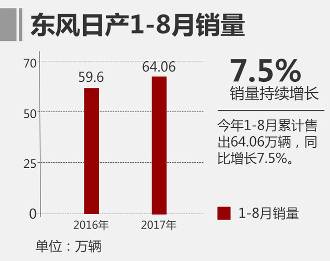 今年是东风日产成立的第十四周年,企业发布了全新五年战略,包括产品、营销、渠道等多方面重新编排,深化中国各大主销区域市场成为核心内容。在这一战略的推动下,东风日产在销量上的表现将有望取得新的突破。网通社从东风汽车官方获悉,东风日产今年1-8月销量为64.06万辆,同比增长7.5%,延续了此前的增长势头。