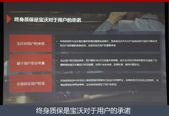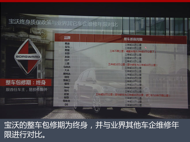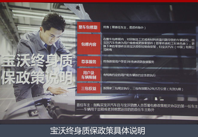 对此,宝沃汽车(中国)售后服务总监汪继承表示:“宝沃是首家提出终身质保概念,同时是唯一实施终身质保的车企。宝沃的基本包修期是3年十万公里,在此基础上延长到终身,并享受3年免费道路救援。”