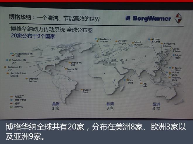 博格华纳在全世界9个国家建立了20个工厂以及研发机构,美洲有8家、欧洲有3家、亚洲有9家。其中,中国有3家,分别在北京、、武汉、荆州。在北京工厂主要生产智能扭矩管理系统。迄今博格华纳已在北京、上海、宁波、大连、太仓、天津六地设有工厂和办事处,其中国区协调中心和研发中心位于上海。