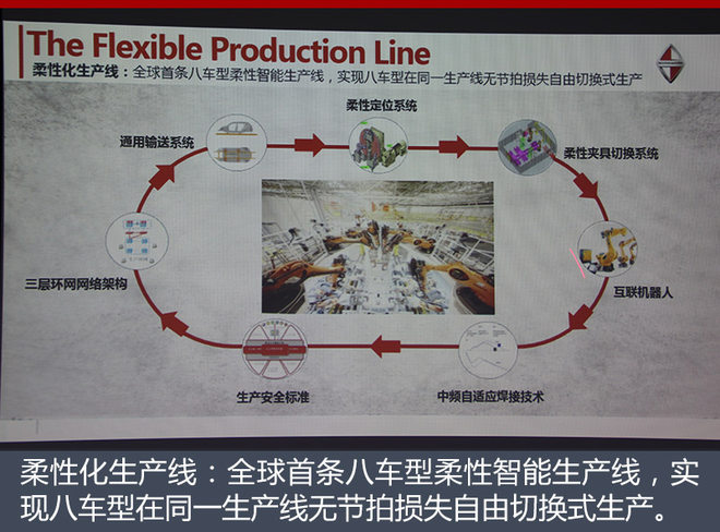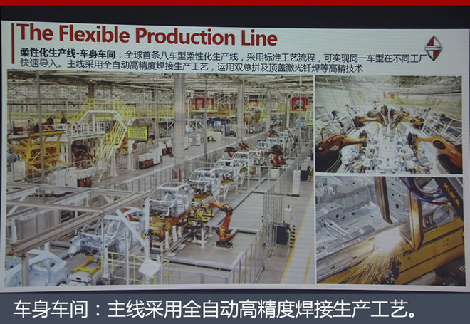 车身车间是全球首条8车型柔性化生产线,采用标准工艺流程,可实现同一车型在不同工厂快速导入。主线采用全自动高精度焊接生产工艺,运用双总拼及顶盖激光钎焊等高精技术。