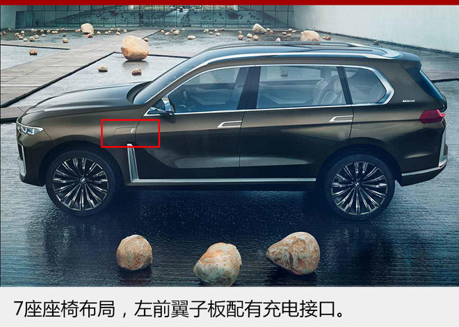 从泄露的官图上来看,全新宝马X7 iPerformance概念车采用7座的布局方式,未来量产版推出后也有望采用相同的设计理念;另外新车左前翼子板处还增有插电接口,以此证明其新能源车的身份。