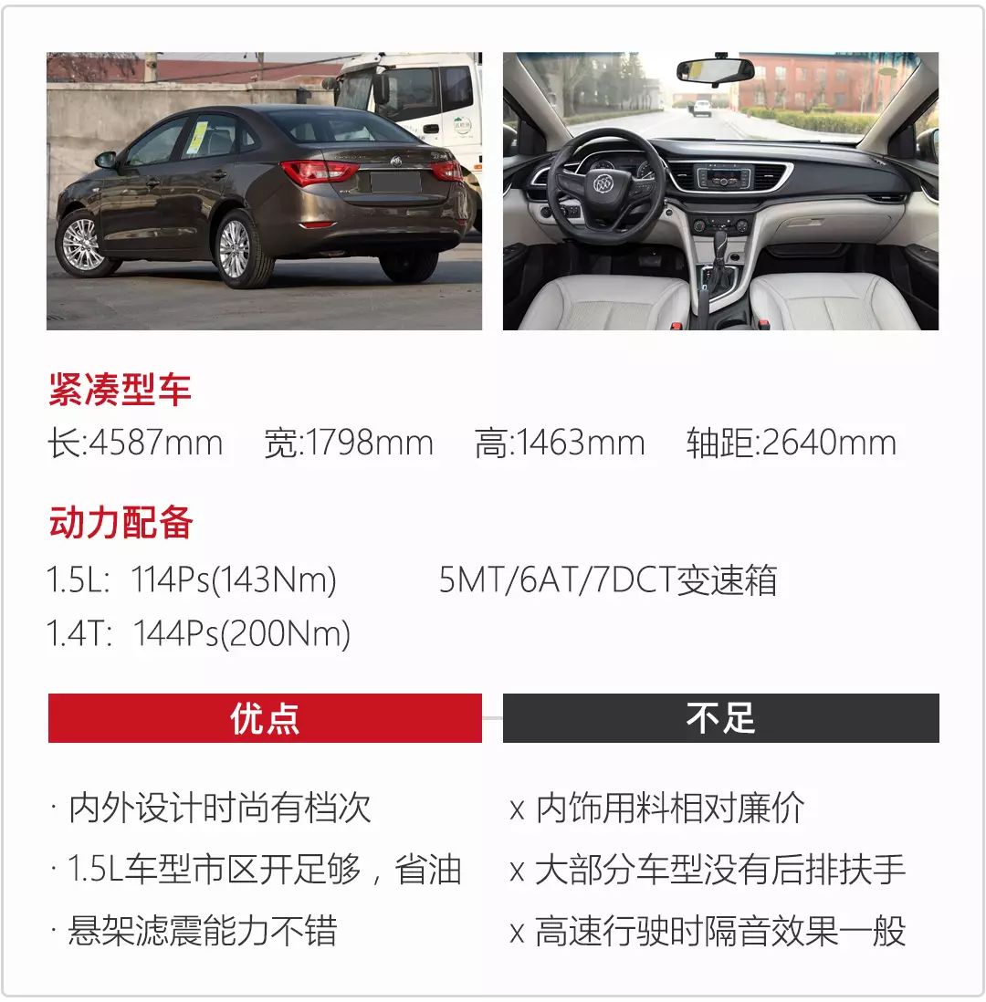 英朗搭载了通用的1.5L发动机,虽然动力没有涡轮增压发动机出众,但依然继承了别克时尚的外观设计和不乏豪华感的内饰。英朗无论在空间还是底盘的舒适性都几乎是紧凑型轿车里的标杆,再加百公里7-8L的低油耗,无论是看自身的表现还是用户的口碑,英朗都是一款让人很放心的家用轿车。