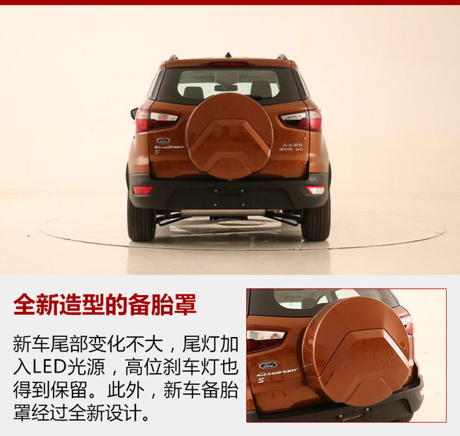 新翼搏尾部变化不大,外挂式备胎得以保留并对备胎罩进行重新设计,保险杠提供银色和黑色不同材质选择。尾灯经过重新设计与前大灯相呼应,内部加入LED光源。此外,不同车型的尾部造型、尾灯和底部护板样式有所差异。