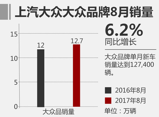 据数据显示,截止到9月份大众品牌已实现累计销售整车超1480万辆,并连续多年夺得单一品牌销量冠军。在刚刚过去的8月中,大众品牌单月新车销量达到127,400辆,相比去年同期的119,981辆,增长6.18%。