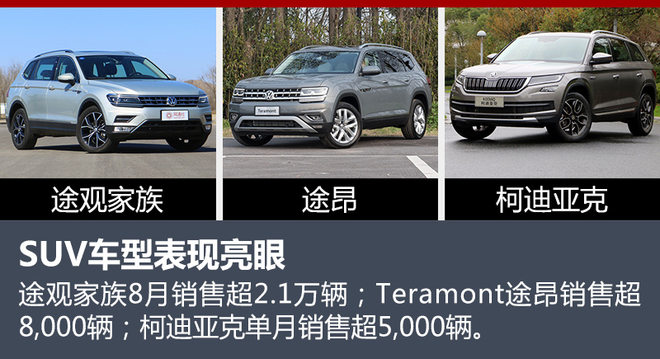 从细分车型来看,SUV的市场表现依旧抢眼,途观家族8月销售超2.1万辆,蝉联国内合资SUV市场第一;Teramont途昂稳居大型SUV市场榜首,新车销售超8,000辆;柯迪亚克自上市以来销量不断攀升,单月销售超5,000辆,在A+级SUV市场表现抢眼。(图/文 网通社 王静亚)