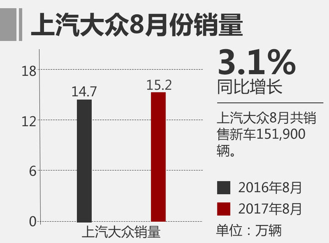 从最新公布的销量数据来看,上汽大众8月份单月销量达到151,900辆,与去年同期相比增长3.1%;今年1-8的累计销量为1,253,969辆,与2016年同期的销量数据相比,呈微增长状态(2016年同期为:1,249,326辆)。