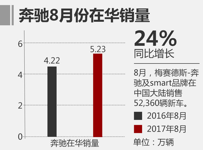 2017年8月,梅赛德斯-奔驰(含smart品牌)在全球范围内共交付新车170,341辆,继续保持稳定的市场发展。网通社从梅赛德斯-奔驰官方获悉,梅赛德斯-奔驰及smart品牌上个月在华销售52,360辆新车,同比增长24%,其中国产车销量增长超过40%。截止到今年9月份,恰逢全新一代E级车上市一周年,据统计,新车累计销量已超过10万辆。